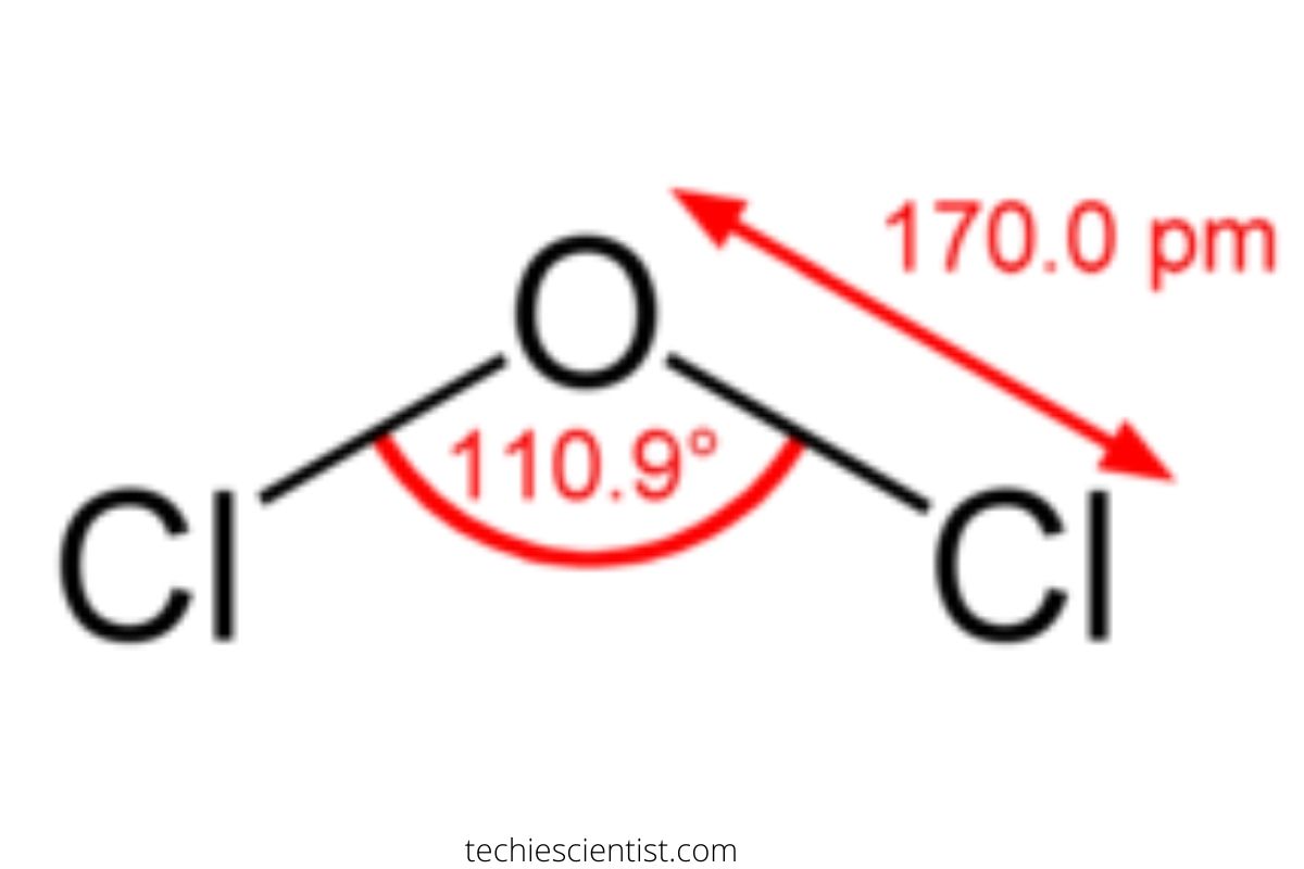氧和氯原子之间的键角(O-Cl)是110.9°使分子弯曲或v型。